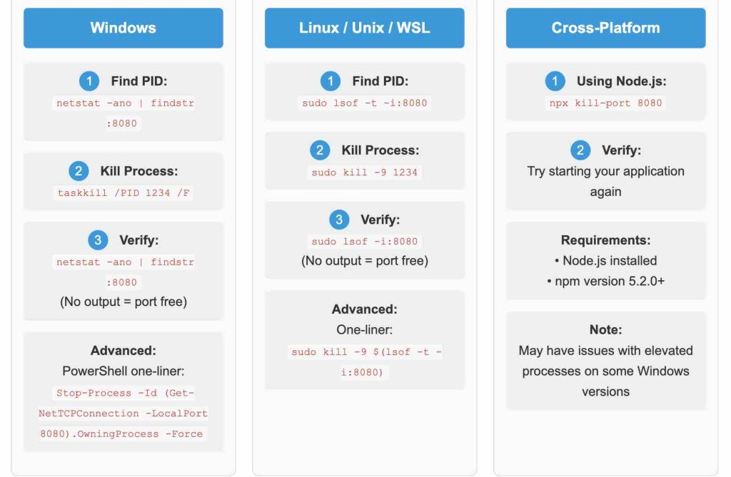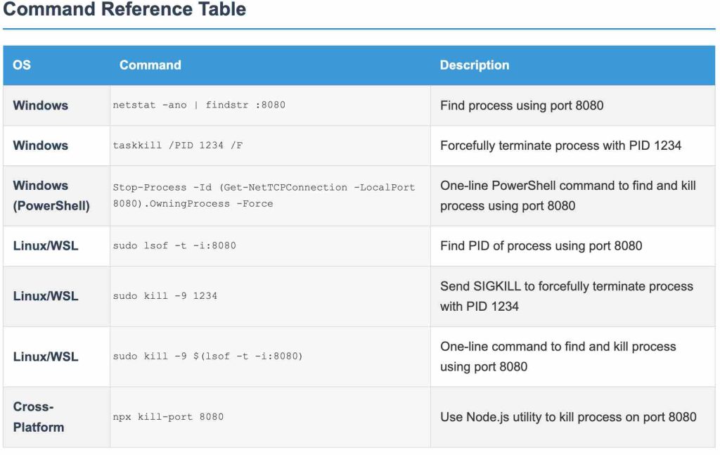 //instead of/with `taskkill` in some Git Bash versions) can vary between different command-line shells. - Tool Availability: Ensure necessary tools like `lsof` or Node.js/npm (for `npx kill-port`) are installed on your system.