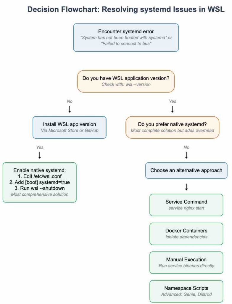 The “System has not been booted with systemd” error in WSL stems from the historical absence of systemd as the default init system. With recent updates, enabling native systemd support in the application version of WSL is now the most direct and often preferred solution, especially for software heavily reliant on it.